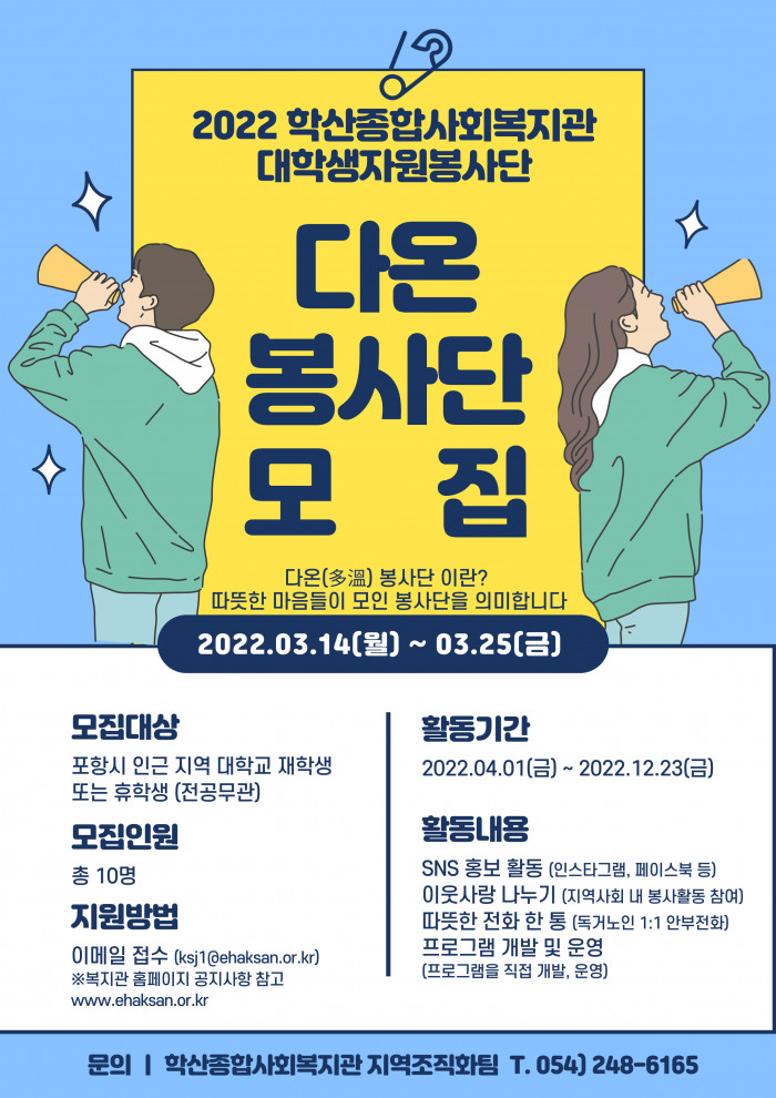 학산종합사회복지관에서는 다음과 같이 대학생 봉사단인 다온(多溫)봉사단을 모집하오니 위덕대학교 재학생 혹은 휴학생들은 많은 신청 바랍니다.