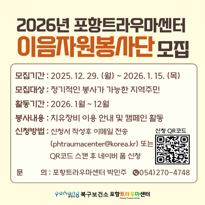 2026년 포항트라우마센터 이음 자원봉사단 참여자 모집을 다음과 같이 안내합니다.